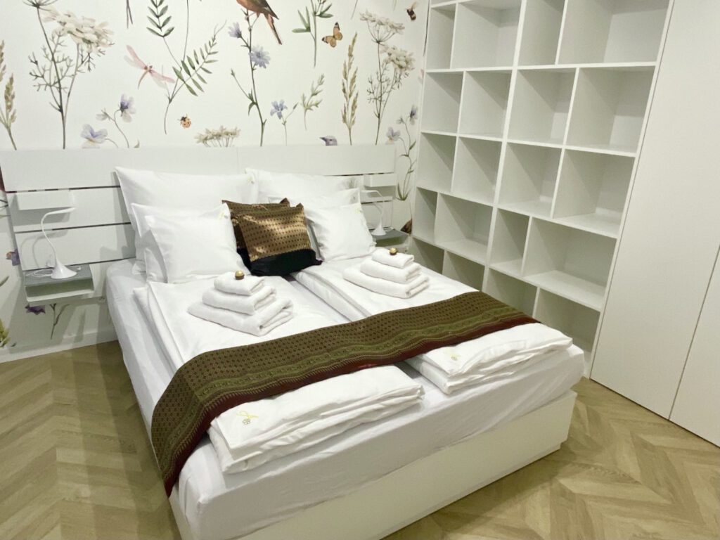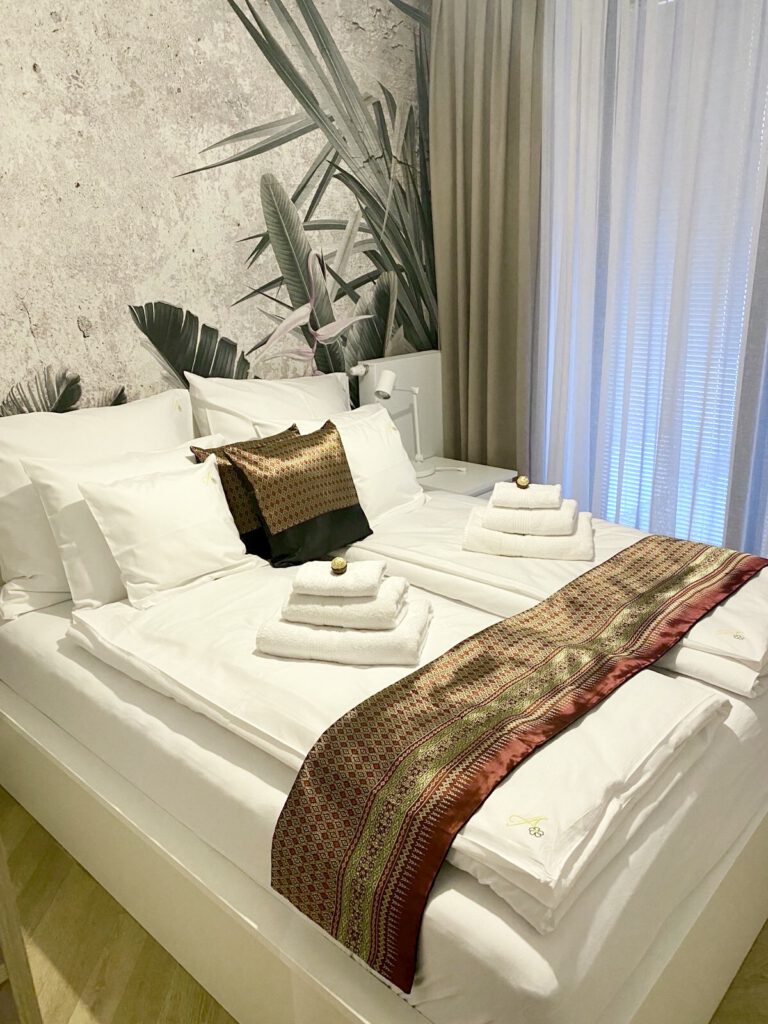 Das helle Gartenapartment „Magnolia“ bietet zwei separate Schlafzimmer, jeweils mit komfortablen Doppelbetten (160×200 cm), und ist modern sowie funktional eingerichtet – ohne Thai-Dekor.